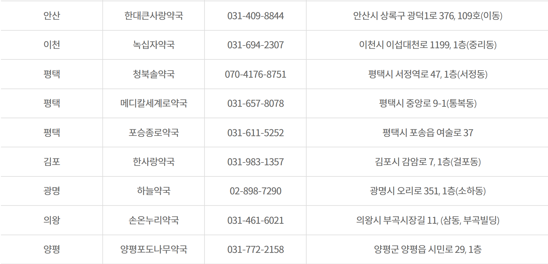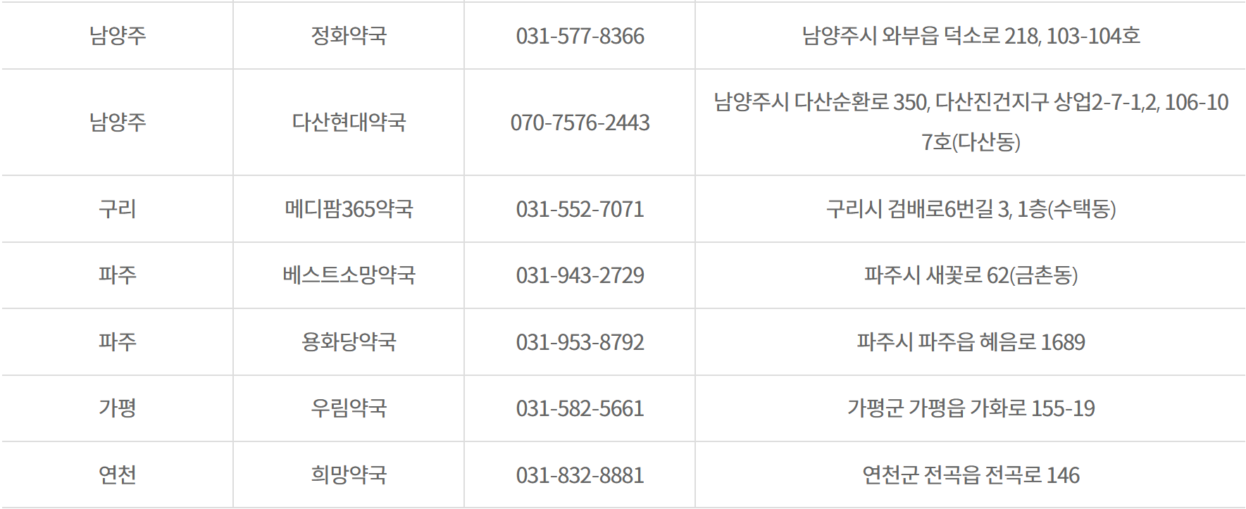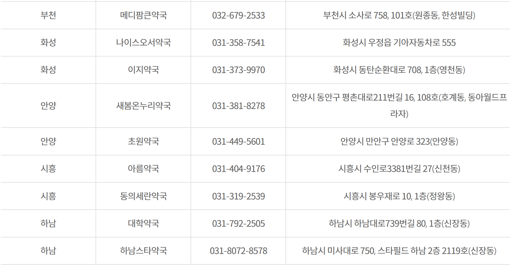경기도 공공심야 약국 365일 심야시간(22:00~익일01:00) 운영하는 약국 33개소 약국명, 전화번호, 소재지를 아래에다 정리하였습니다. 해당지역 심야약국 참고하세요.