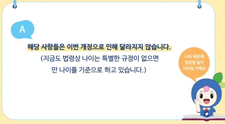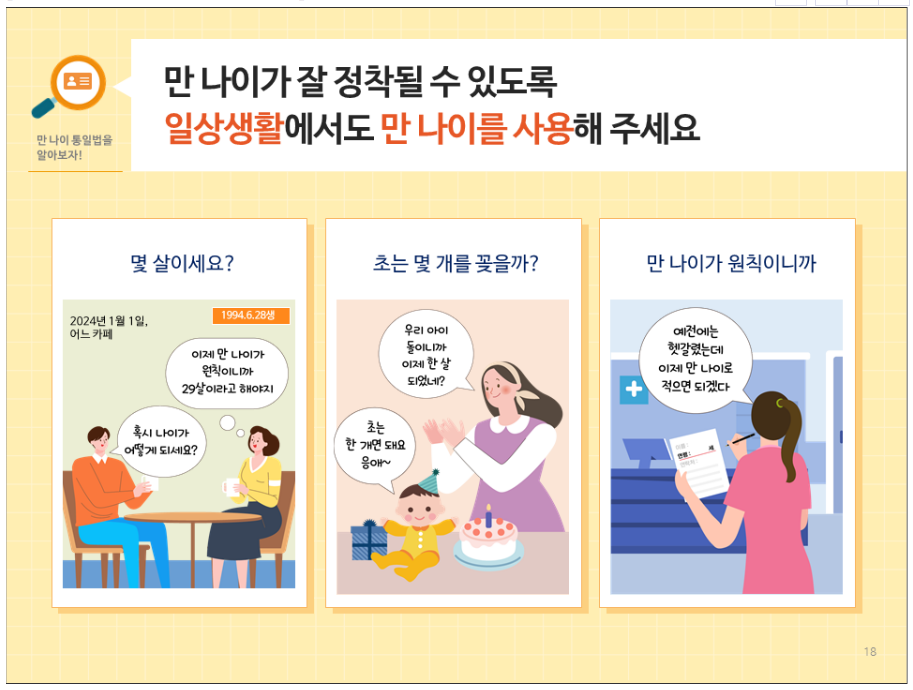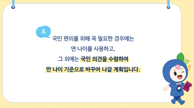 ※ 만 나이로 법적, 사회적 기준통일로 일상생활에서도 만 나이 사용을 지속적으로 유지하다 보면 어느세 자연적으로 사회화가 될겁입니다. 만 나이 사용을 생활화 합시다.