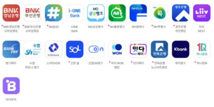 - 신한 쏠, NH올원뱅크, 케이뱅크, 신형ON뱅크 등
