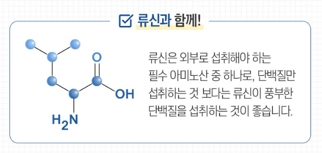 * 류신은 외부로 섭취해야 하는 필수 아미노산 중 하나로, 단백질만 섭취하는 것보다는 류신이 풍부한 단백질을 섭취하는 것이 좋습니다.