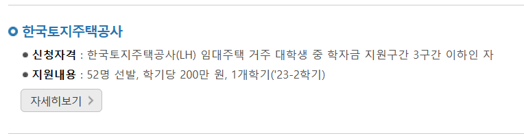 - 한국토지주택공사(LH) 임대주택 거주 대학생 중 학자금 지원구간 3구간 이하인 자
