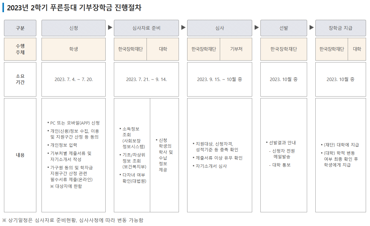 - 신청자격 : 대한민국 국적의 국내 4년제 및 전문 대학교 재학생 (전공대, 대학원생, 방송통신대, 원격대, 사이버대, 기능대, 평생교육원은 제외), 신입생. 편입생 제외, 푸른 등대 기부장학금 신청 시작일 기준 잔여 정규학기가 1개 학기 이상인 자