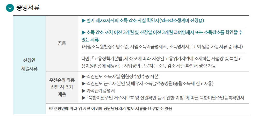 - 소속되어 있는 노무제공 사업장의 경영상의 이유( 근로시간 단축, 휴업, 휴직 등)로 소득이 감소하여 이에 따른 생활유지에 드는 비용
