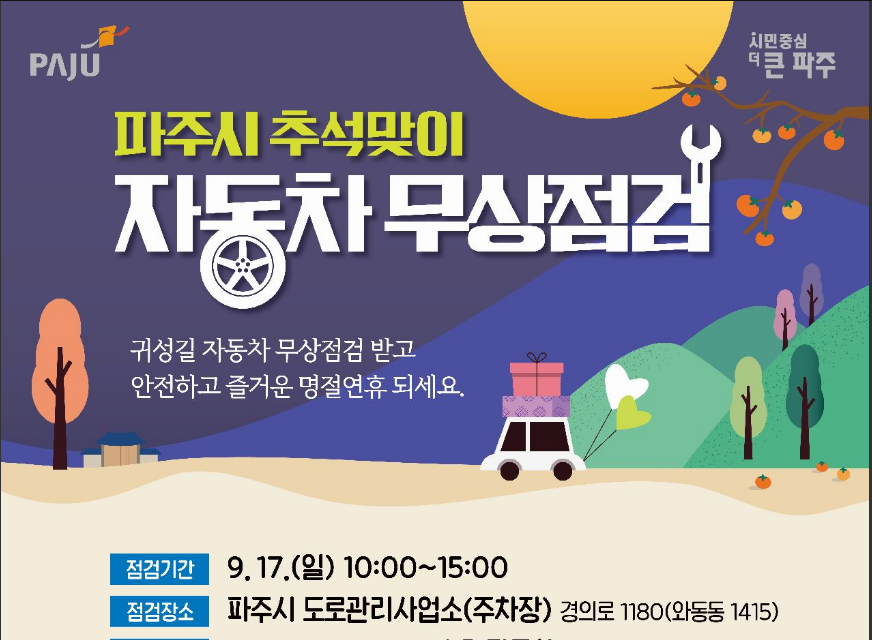 민족 고유명절인 추석을 맞이하여 파주시민분들 및 관내 직장인 분들을 위하여 고향방문 자동차의 안전운행 무상점검을 실시하오니 파주시민분들은 자동차 무상점검받으세요 자세한 내용은 아래를 참조하세요.