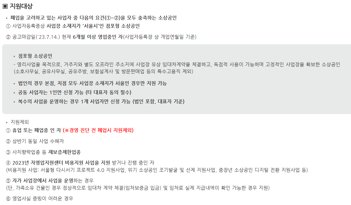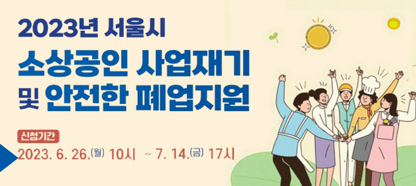 서울시에서는 불가피하게 영업장 폐업 선택의 기로에 있는 소상공인에게 경영진단을 통한 운영방향을 제시하고 실패비용 최소화와 재기를 지원하는 '2023년 하반기 소상공인 사업재기 및 안전한 폐업지원' 대상을 아래와 같이 모집한다고 합니다.
