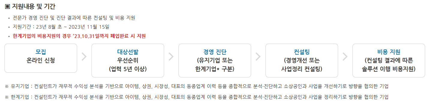 폐업을 고려하는 소상공인 대상 전문가 경영진단 및 이에 따른 맞춤형 종합지원으로 안전한 퇴로 지원 또는 경영정상화에 기여하고자 함 점포형 소상공인 - 영리사업을 목적으로, 거주지와 별