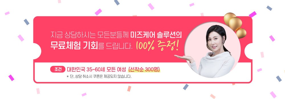 - 4~50대 여성분들 운동하고 호르몬제 먹고 좋다는 음식 먹어봐도 좀처럼 개선되지 않는 내몸의 갱년기 증상 들 호르몬 불균형으로 인한 증상을 해결하고 신경의 재생과 골반근육의 기능을 회복하며 내 몸의 변화를 체험하세요. 여기 미즈케어 솔루션으로 확실한 효과를 보세요.