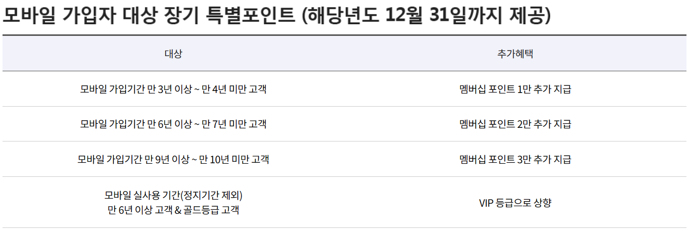| VVIP | 150,000P | 연간이용금액 200만원 이상 또는 VVIP요금제 가입자 대상 - 초이스 프리미엄, 초이스 스페셜, 스페셜 등 |